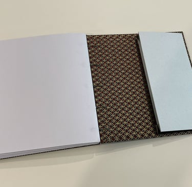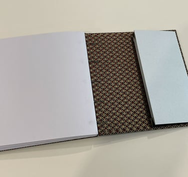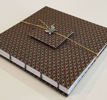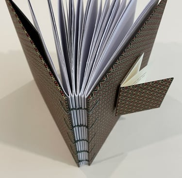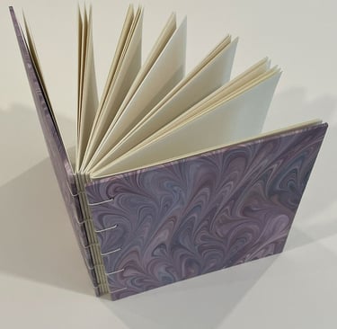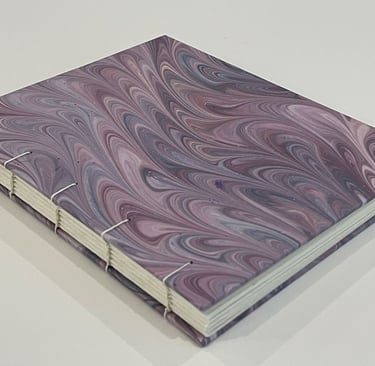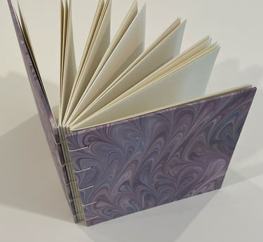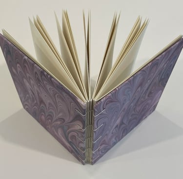 Some recent projects experimenting with an exposed Coptic stitch binding. Chiyogami Paper and Marbled Papers. The first journal has a small book embellishment on the cover with a quote inside, the back cover has an expandable pocket. A decorative box was made to house the journal (not shown).